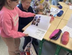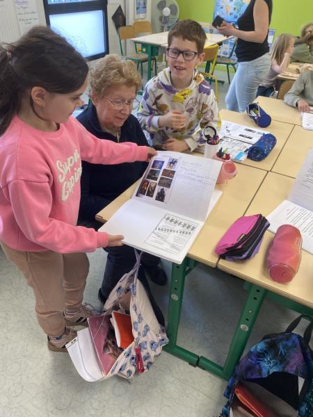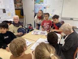 Les élèves ont ensuite fait découvrir leur classe et leur mascotte voyageuse, qui parcourt différents pays au fil de l’année. Par petits groupes, les résidents se sont installés aux tables de la classe avec les enfants pour feuilleter et découvrir leur cahier de voyage. Ce moment d’échange, simple et authentique, a permis de belles discussions et beaucoup de curiosité de part et d’autre.