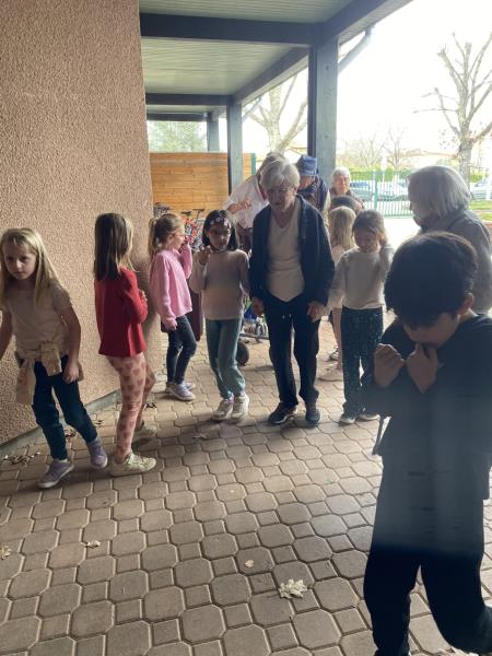 La rencontre a débuté par un temps de présentation : les enfants se sont présentés à tour de rôle, tout comme les résidents. Les élèves avaient préparé un petit spectacle qu’ils ont eu le plaisir d’offrir à leurs invités. Très vite, l’ambiance s’est faite joyeuse et conviviale : enfants et résidents ont chanté et dansé ensemble, partageant notamment une chorégraphie sur des musiques d’hier comme Les Champs‑Élysées, ainsi qu’une valse à deux et à trois temps.